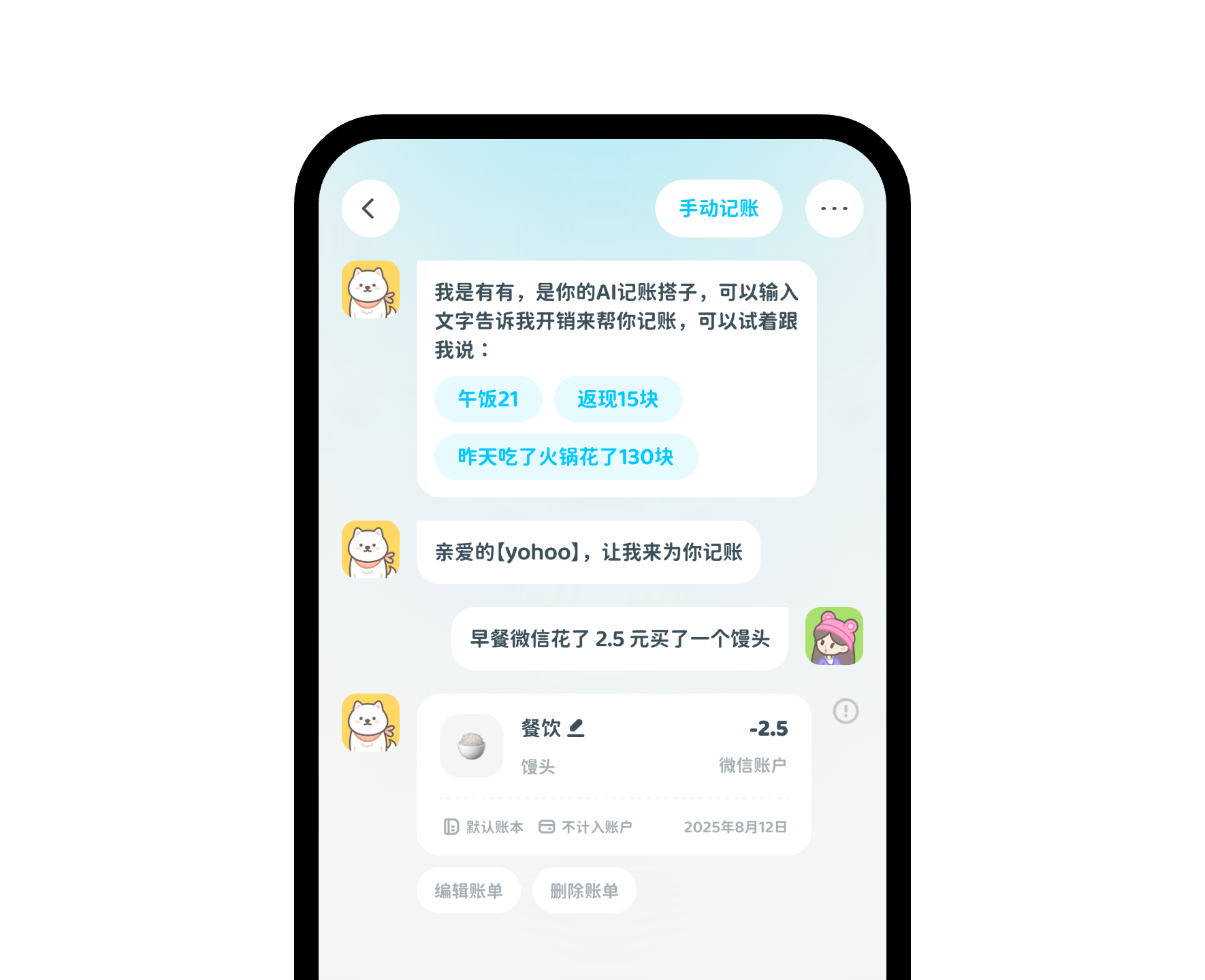 试试和TA说“午餐30元”,AI会自动识别账单金额、分类等信息完成记账。每次记账AI角色都有可能进行消息回复,情绪价值拉满~