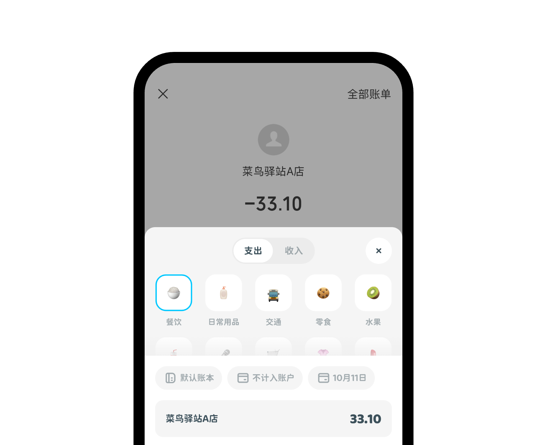 微信、支付宝等软件付款后,智能识别交易金额、类别、时间等信息,自动归类收支项目,准确生成账单记录,实现1秒记账!