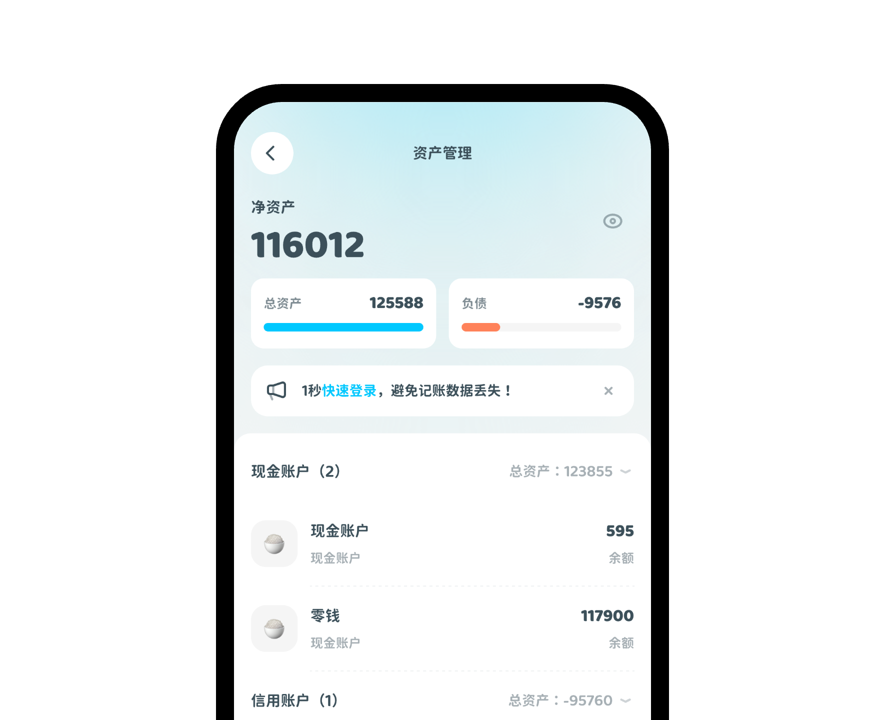 拥有丰富的账户管理类型,支持记账、转账、充值和还款功能,让你全面了解你的各账户余额,手有余粮心不慌。